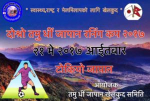 टोकियो – तमु धीं जापानको आयोजनामा दोश्रो तमु धीं जापान रनिङ्ग कप फुटसल प्रतियोगिता हुने भएको छ । “स्वास्थ्य, राष्ट्र र मेलमिलापको लागि खेलकुदू” भन्ने मूल नाराका साथ मे २१ तारिक (आईतबार)का दिन प्रतियोगिता गर्न लागिएको हो ।