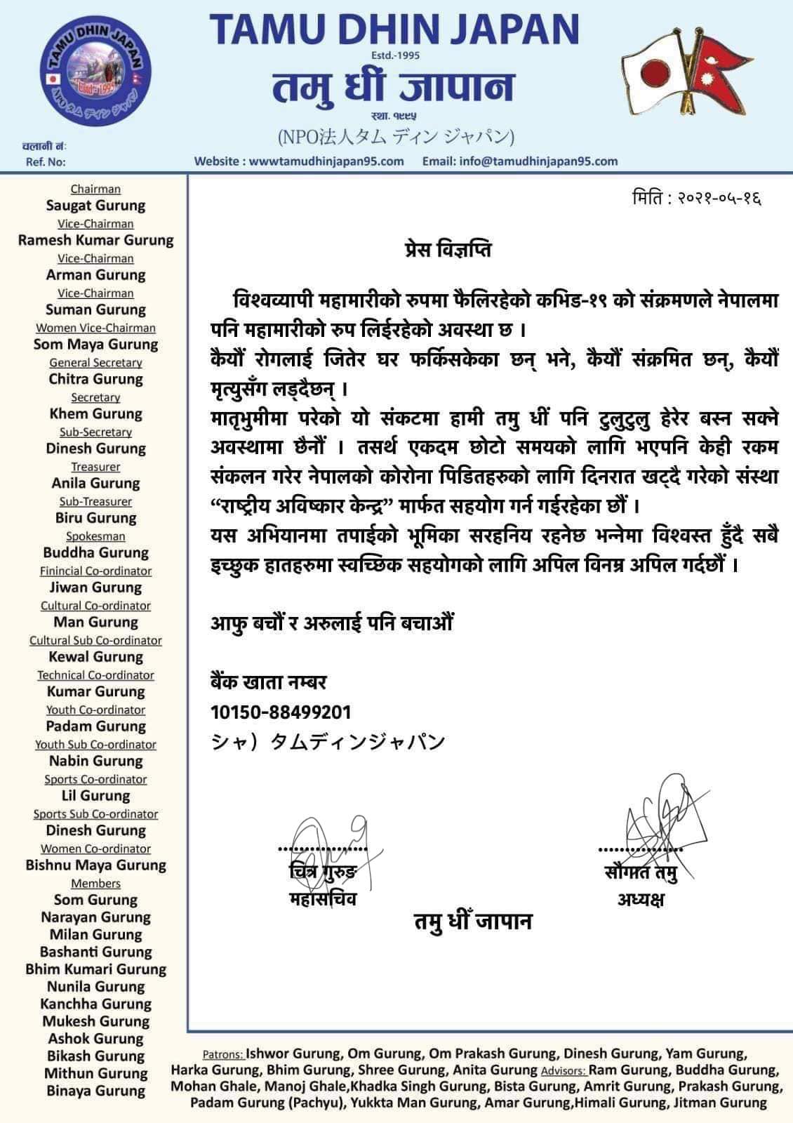 विश्वव्यापी महामारीको रुपमा फैलिरहेको कभिड-१९ को संक्रमणले नेपालमा पनि महामारीको रुप लिईरहेको अवस्था छ । कैयौं रोगलाई जितेर घर फर्किसकेका छन् भने, कैयौं संक्रमित छन्, कैयौं मृत्युसँग लड्दैछन् । मातृभुमीमा परेको यो संकटमा हामि तमु धीं पनि टुलुटुलु हेरेर बस्न सक्ने अवस्थामा छैनौं । तसर्थ एकदम छोटो समयको लागि भएपनि केही रकम संकलन गरेर नेपालको कोरोना पिडितहरुको लागि दिनरात खट्दै गरेको अभियानता महाबीर पुनको संस्था “राष्ट्रीय अविष्कार केन्द्र” मार्फत सहयोग गर्न गईरहेका छौं । यस अभियानमा तपाईको भूमिका सरहनिय रहनेछ भन्नेमा विश्वस्त हुँदै सबै इच्छुक हातहरुमा स्वच्छिक सहयोगको लागि अपिल विनम्र अपिल गर्दछौं ।